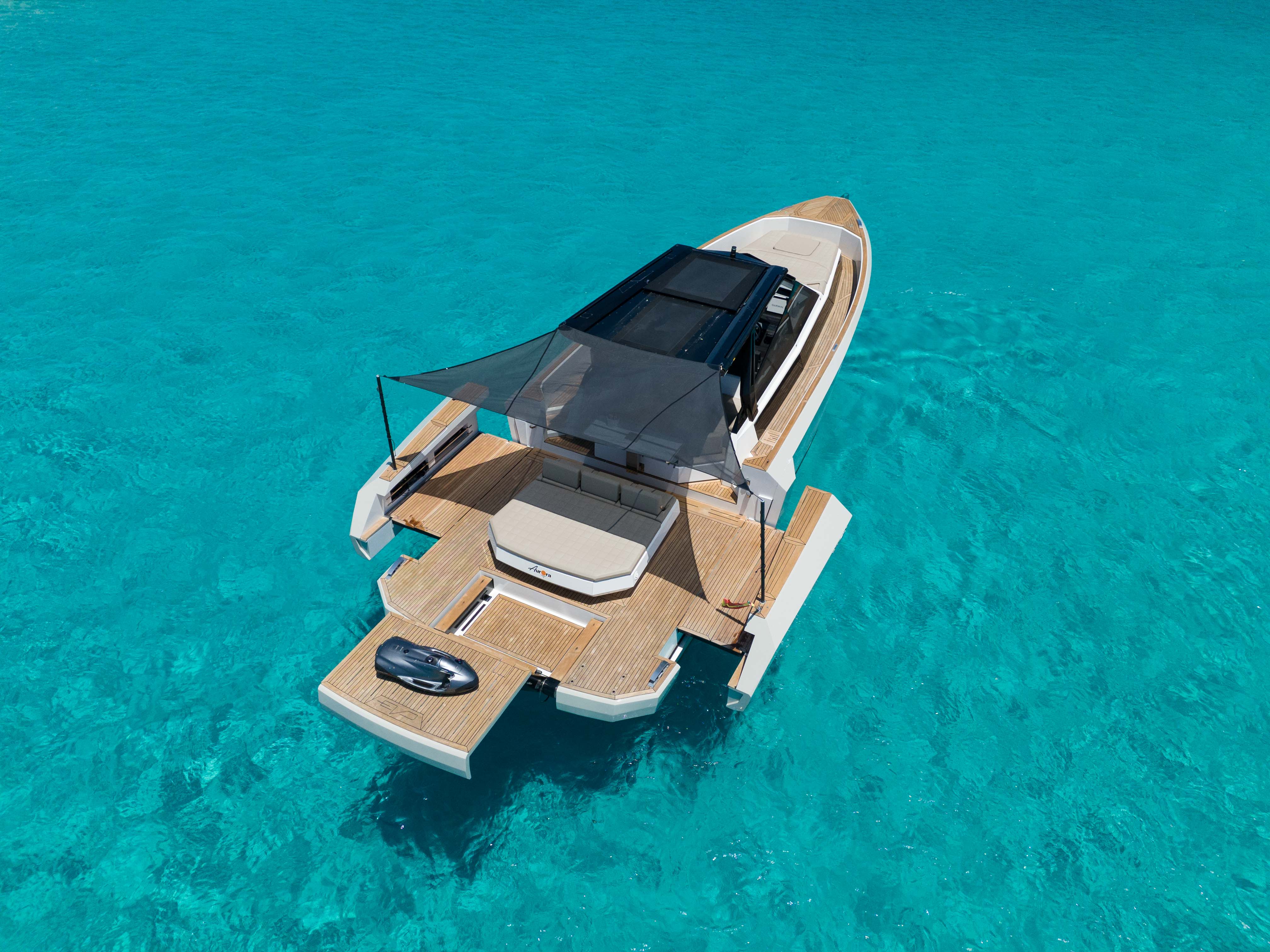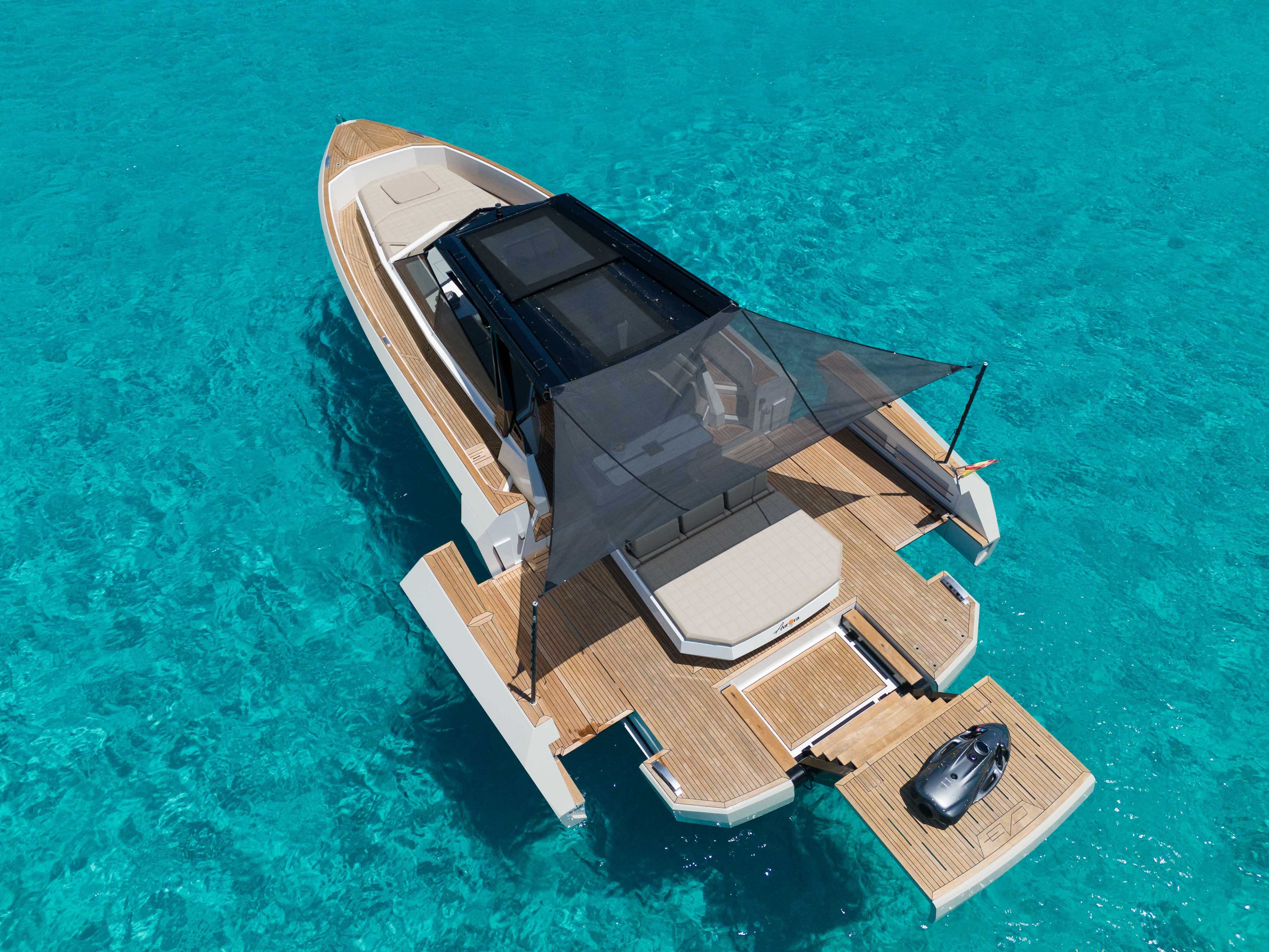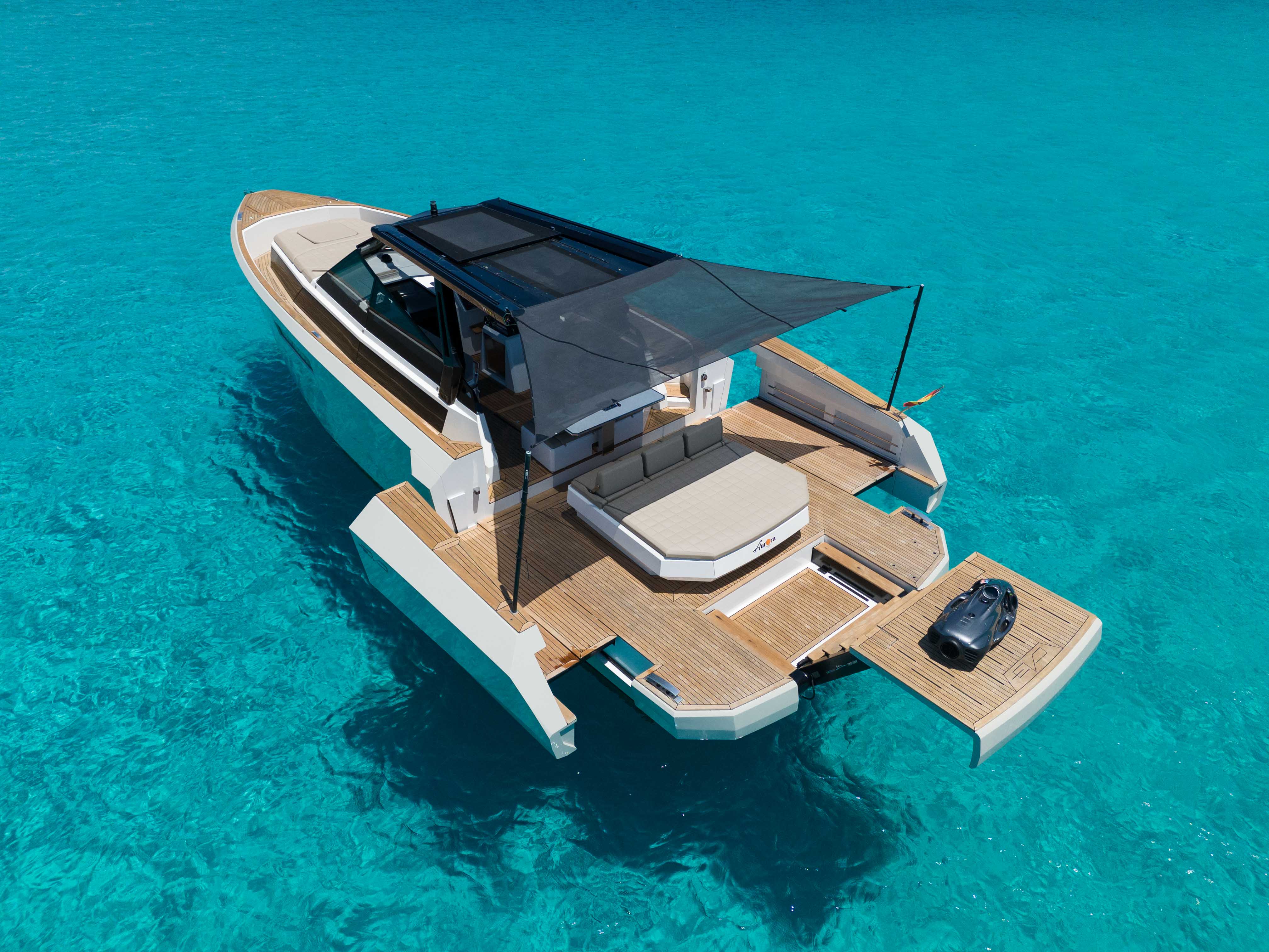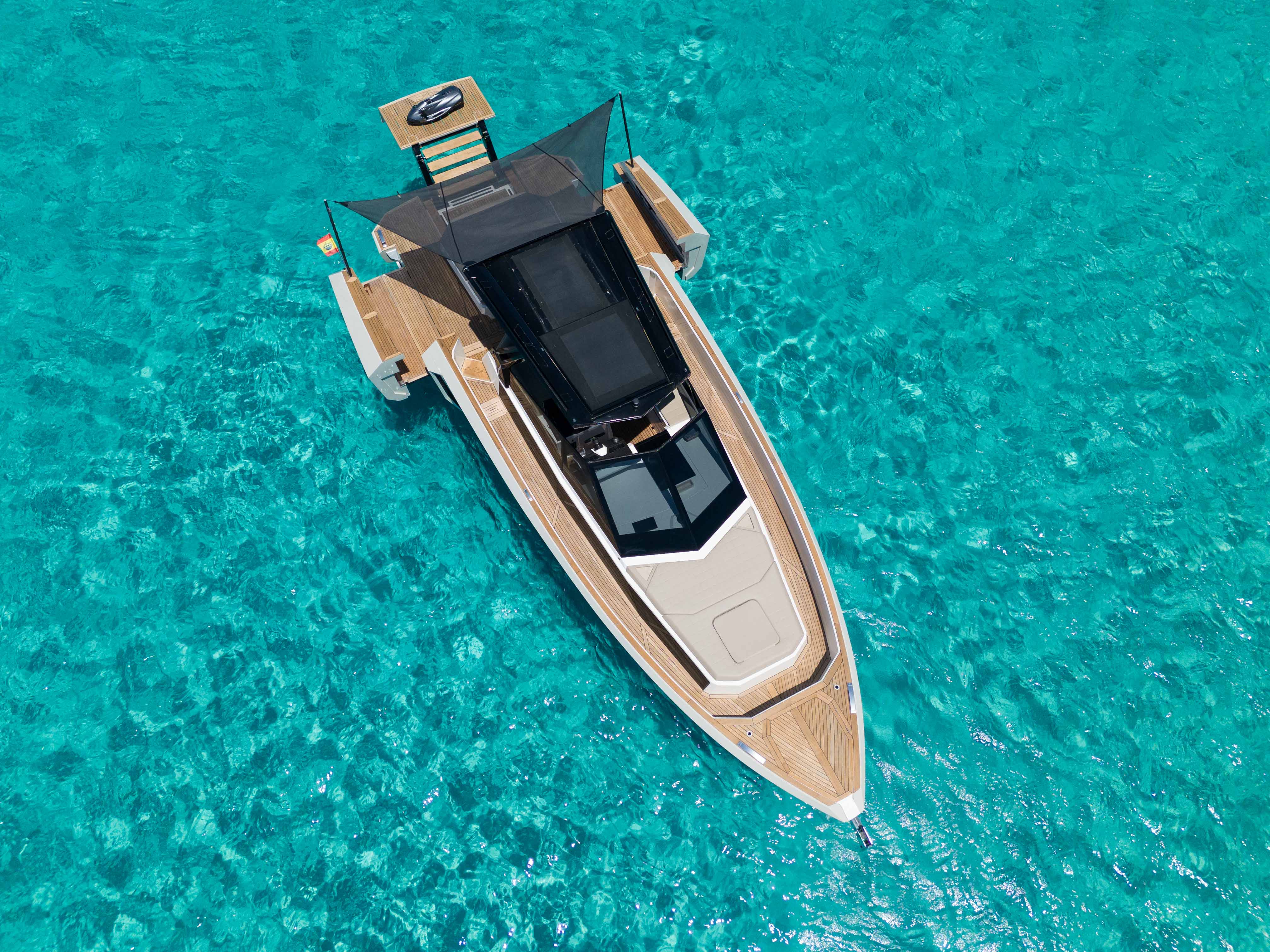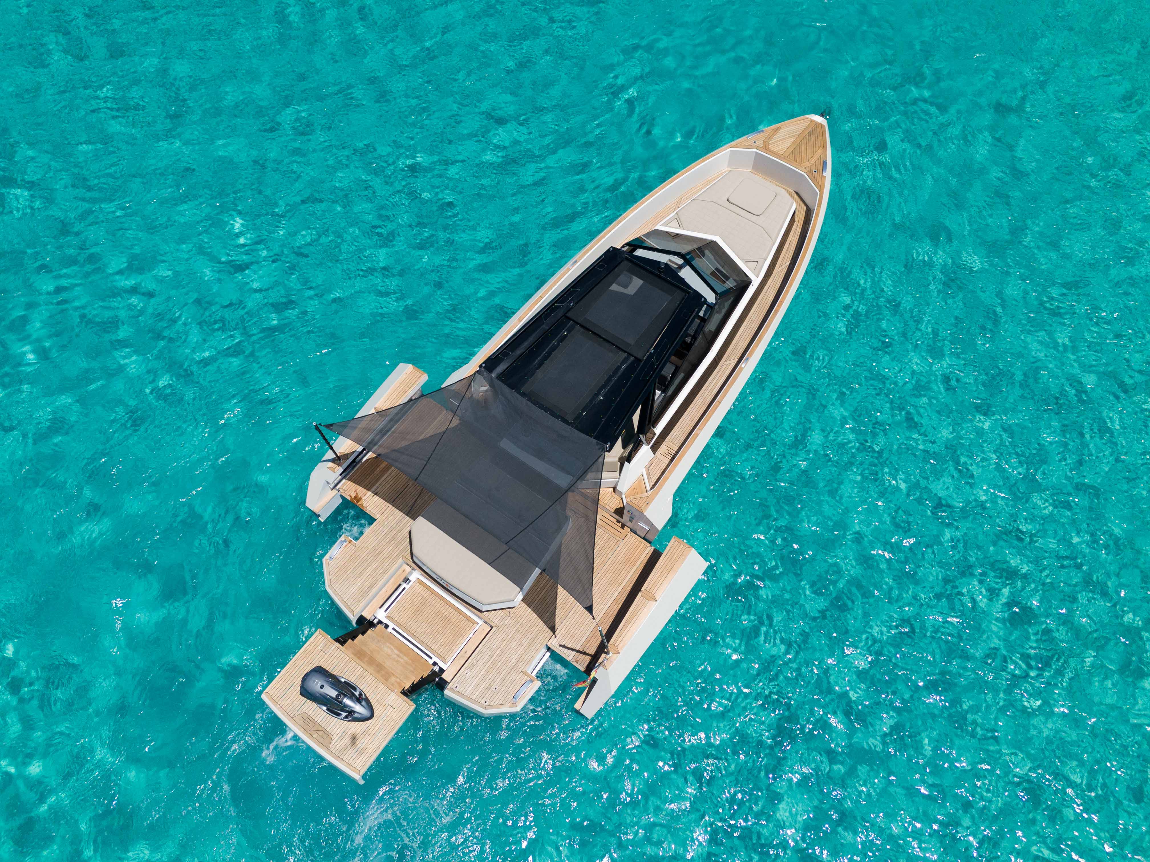 Discover a unique nautical experience with the Evo 43 , a modern and innovative yacht with capacity for up to 11 people . This boat stands out for its cutting-edge design, offering a hydraulic platform and a deck expansion system , which allows the beam to be extended from 4.45 m to 6.30 m for greater comfort and space on board.